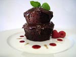 cocoa powder, flour, silken tofu, vanilla, maple syrup, filled with vegan chocolate ganache, topped with raspberry sauce & drizzled with caramel glaze