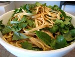 soba noodles tossed with soba sauce, tahini, peanut butter, garlic, ginger, sesame oil, honey, garnished with scallions