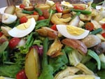 romaine, artichokes, cucumbers, fennel, green beans, tomatoes, red onion, mixed olives, roasted potato, hard boiled eggs drizzled with extra-virgin olive oil